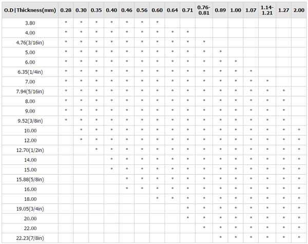 Outside diameter: 1/4inch, 3/8inch, 1/2inch, 5/8inch, 3/4inch, 7/8inch, 1inch, etc.