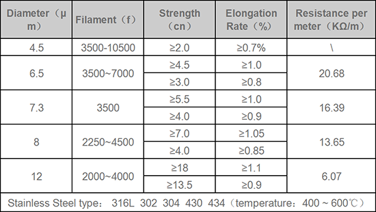 The stainless steel fiber is made of stainless steel wire in a bundle drawing process and the diameter varies from 1 μm to 40 μm. It has a metallic color of stainless steel and a bright surface. Since the stainless steel wire diameter is micron level, new characteristics are produced in addition to the original metal properties, which not only maintains the electrical conductivity, thermal conductivity, corrosion resistance like the stainless steel, but also obtains softness and fine-surface-area similar to those of chemical fiber products. These characteristics are the substrates for producing various stainless steel fiber products.