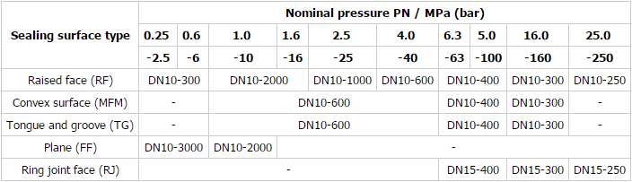Plane (FF), Raised Face (RF), uneven surfaces (MFM), tongue and groove surface (TG), ring joint surface (RJ)